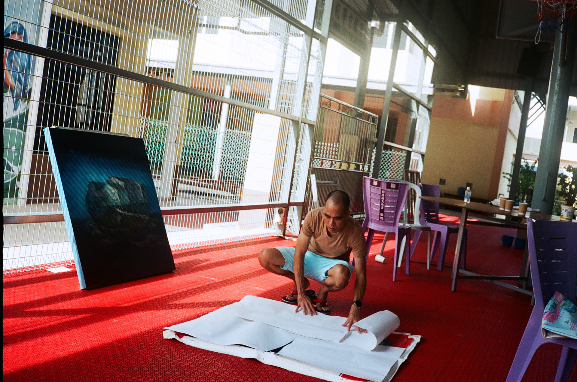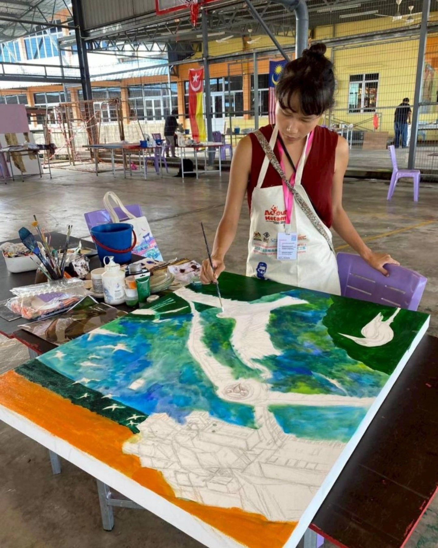 我使用了壓克力與水粉顏料作為創作媒材,在5天內完成作品,我在台灣也事先準備了草圖,到吉膽島直接構圖作業,並感受東南亞濃烈色彩、當地文化的氣息進行創作。