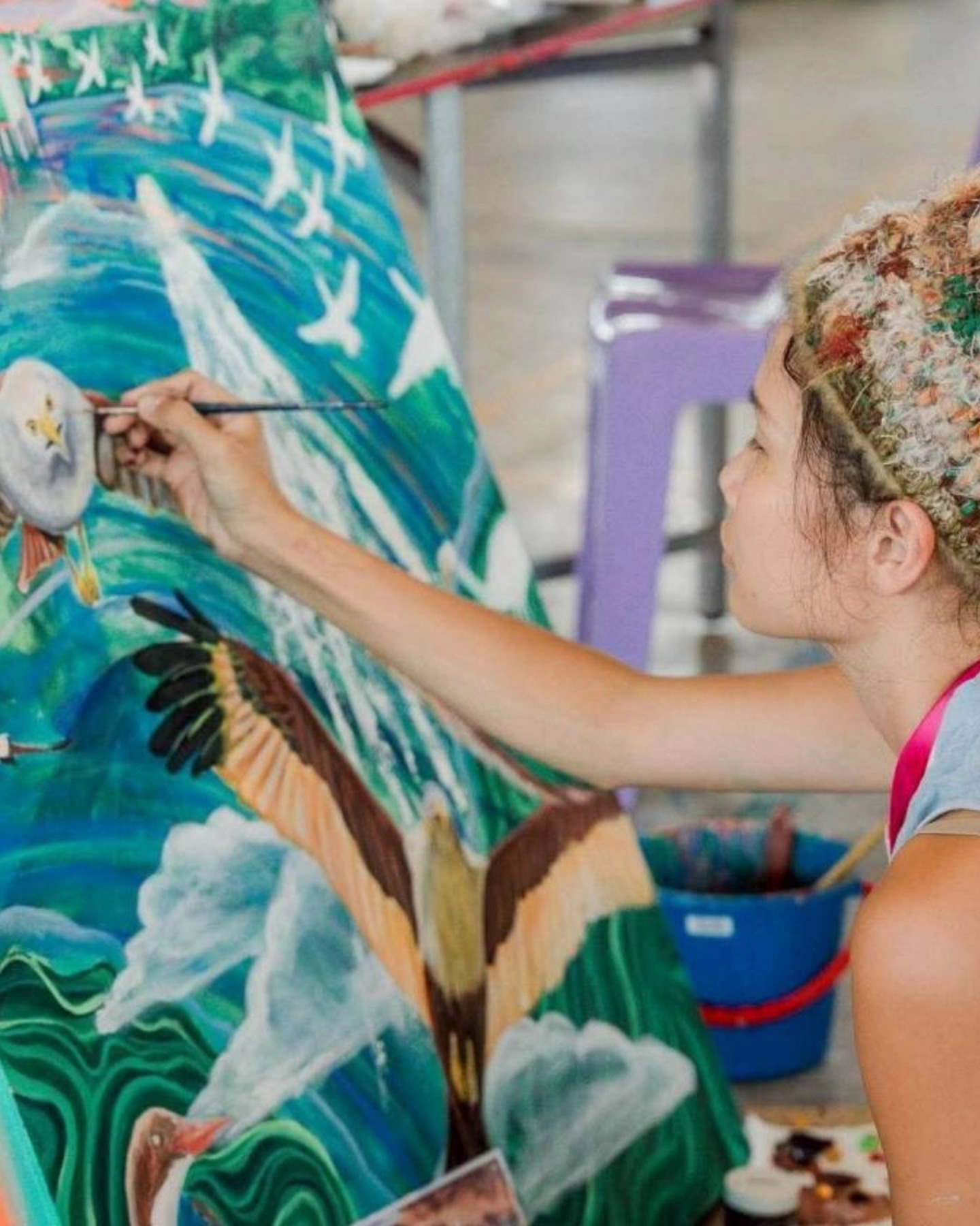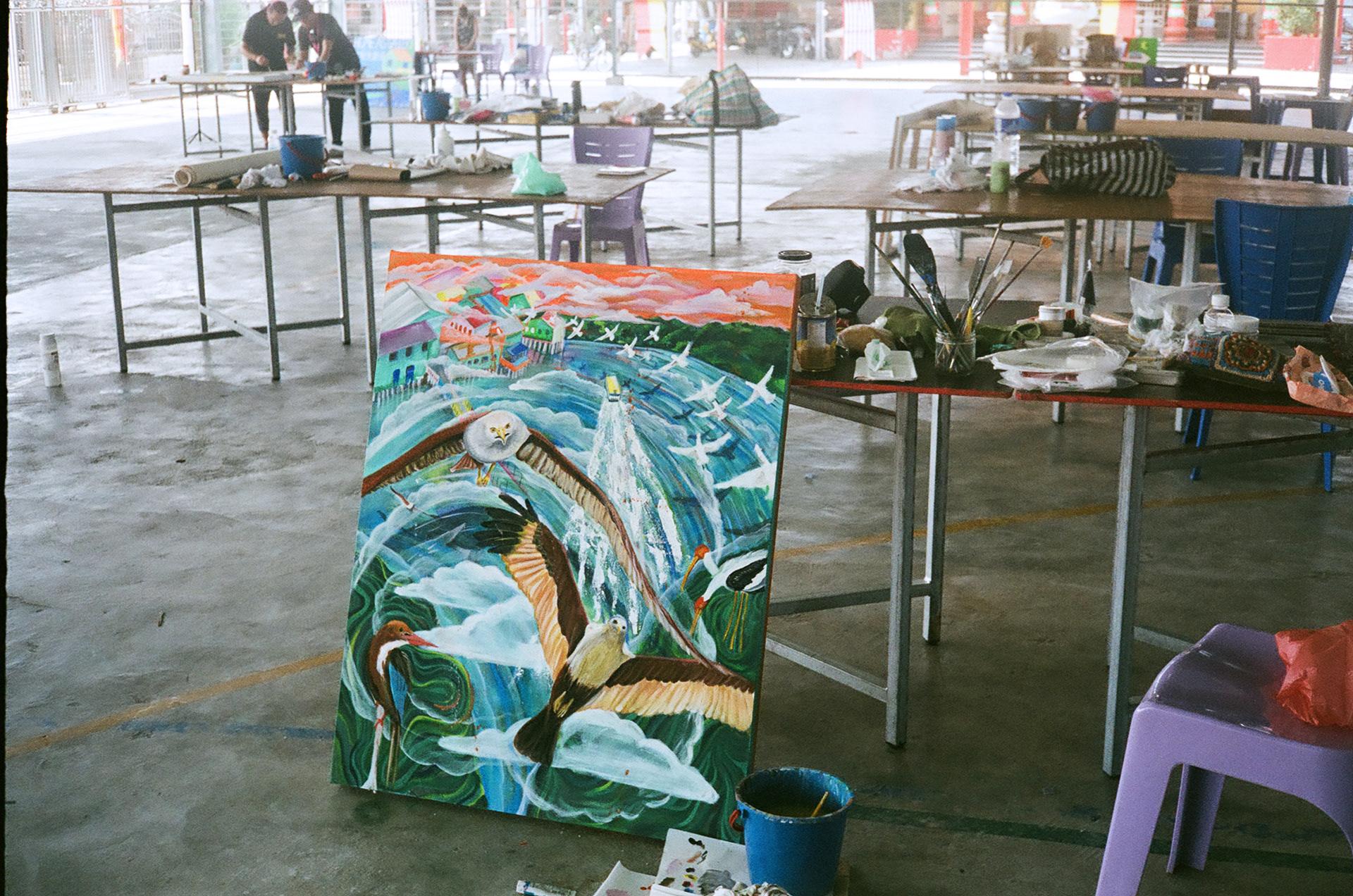 在吉膽島創作這張作品:80cm x 100cm“Birds Eye Views”,靈感來自吉膽島本身——這座濕地島嶼環繞著紅老鷹、翠鳥、白鷺鷥等候鳥,就如同島上居民的多樣與流動。吉膽島的多元人口與交織的文化,記錄著歷史的痕跡與氣息。而鮮豔的色彩,正如熱帶島嶼的食物與氣候,強烈而鮮明。